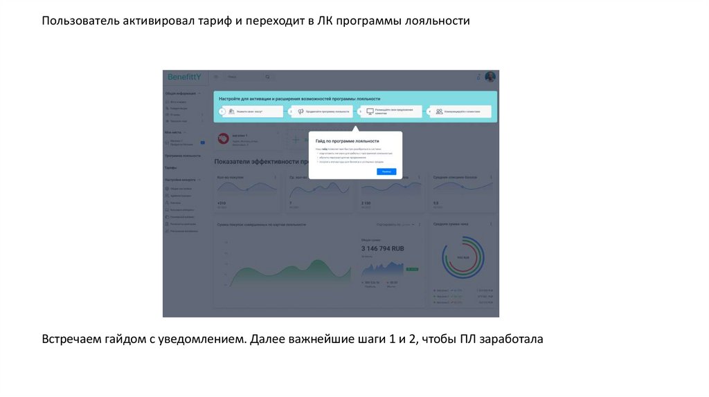 Пользователь активировал тариф и переходит в ЛК программы лояльностиВстречаем гайдом с уведомлением. Далее важнейшие шаги 1 и 2, чтобы ПЛ заработала