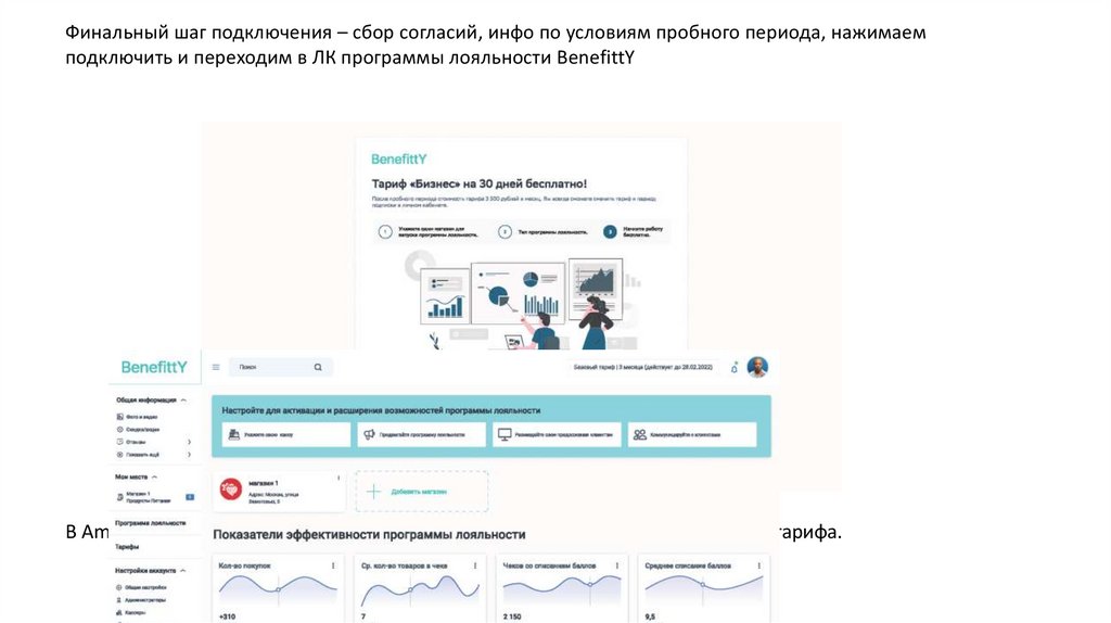 Финальный шаг подключения – сбор согласий, инфо по условиям пробного периода, нажимаемподключить и переходим в ЛК программы лояльности BenefittY