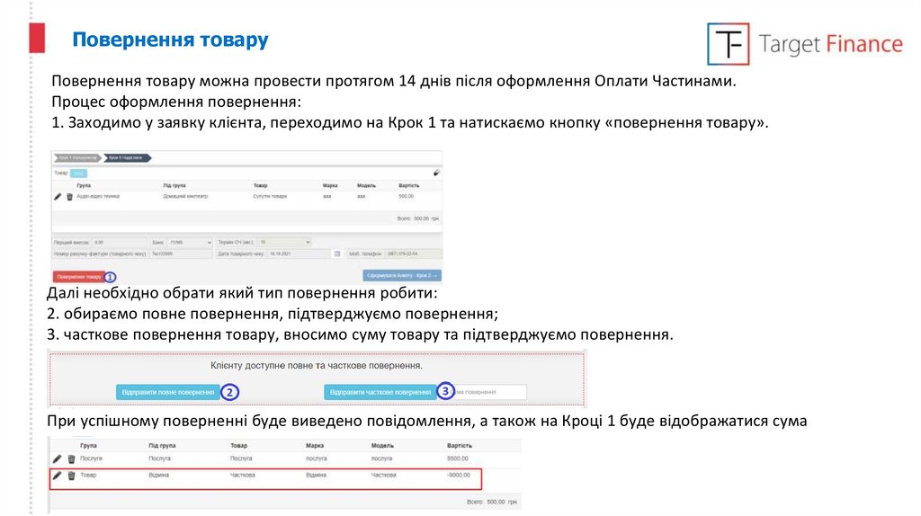 3. часткове повернення товару, вносимо суму товару та підтверджуємо повернення.
