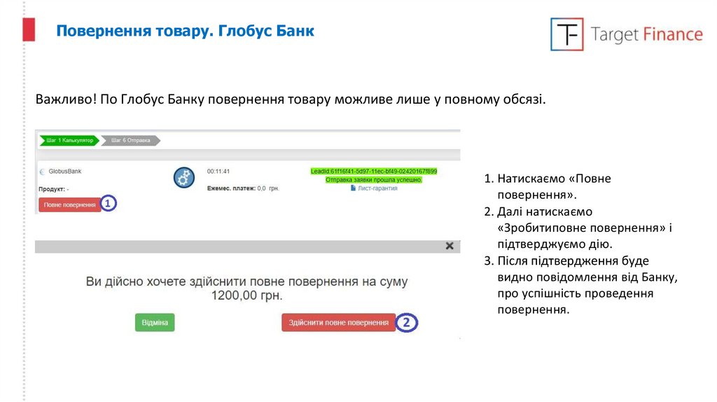 Повернення товару. Глобус БанкВажливо! По Глобус Банку повернення товару можливе лише у повному обсязі.