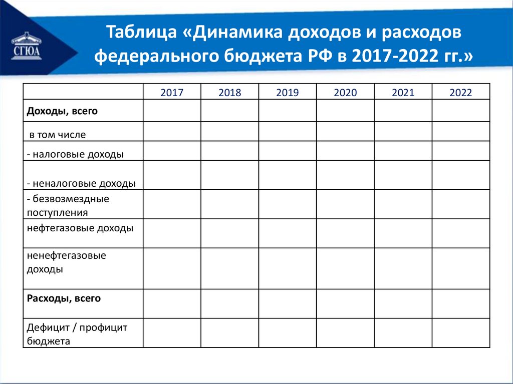 Таблица «Динамика доходов и расходовфедерального бюджета РФ в 2017-2022 гг.»
