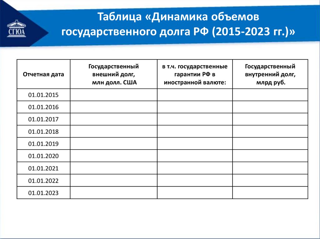 Таблица «Динамика объемовгосударственного долга РФ (2015-2023 гг.)»