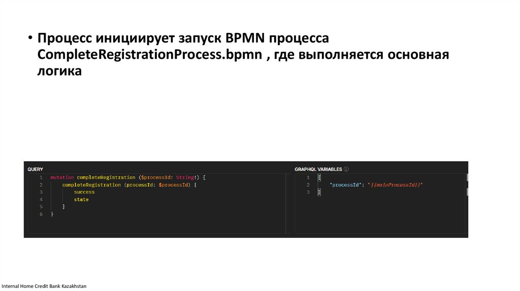 • Процесс инициирует запуск BPMN процессаCompleteRegistrationProcess.bpmn , где выполняется основная