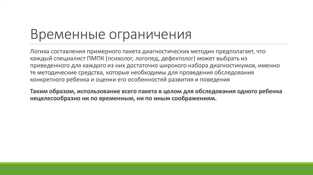 Временные ограниченияЛогика составления примерного пакета диагностических методик предполагает, что