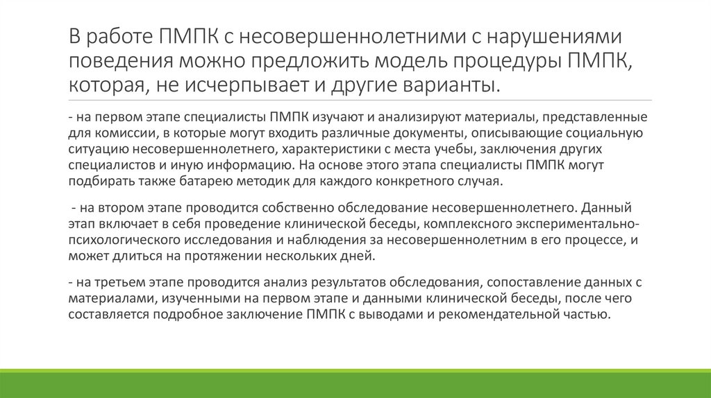 В работе ПМПК с несовершеннолетними с нарушениямиповедения можно предложить модель процедуры ПМПК,