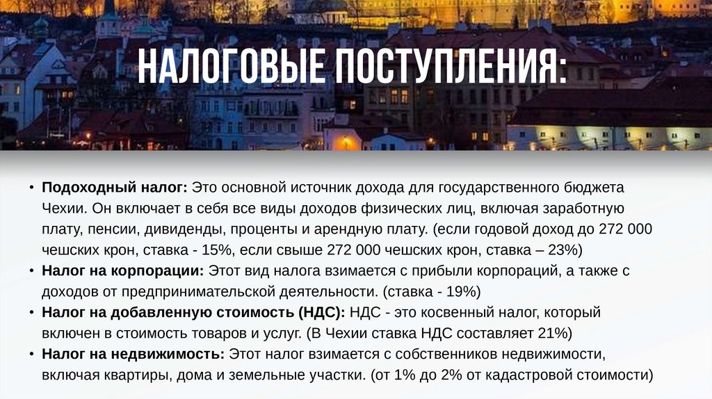 доходов бюджета. В Чехии установлено неск ольк о видов нал огов,