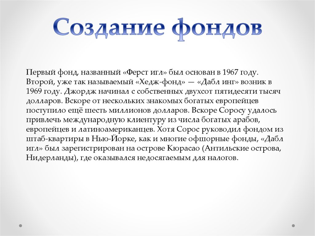 Первый фонд, названный «Ферст игл» был основан в 1967 году.Второй, уже так называемый «Хедж-фонд» — «Дабл инг» возник в