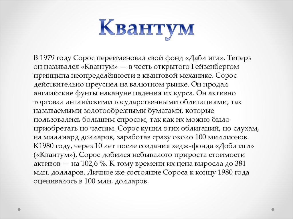В 1979 году Сорос переименовал свой фонд «Дабл игл». Теперьон назывался «Квантум» — в честь открытого Гейзенбергом