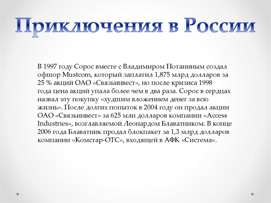 В 1997 году Сорос вместе с Владимиром Потаниным создалофшор Mustcom, который заплатил 1,875 млрд долларов за