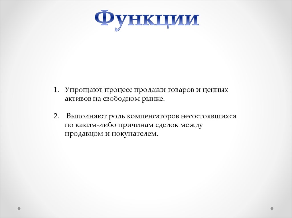 1. Упрощают процесс продажи товаров и ценныхактивов на свободном рынке.