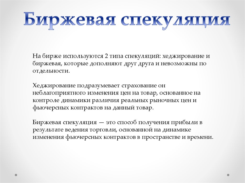 На бирже используются 2 типа спекуляций: хеджирование ибиржевая, которые дополняют друг друга и невозможны по