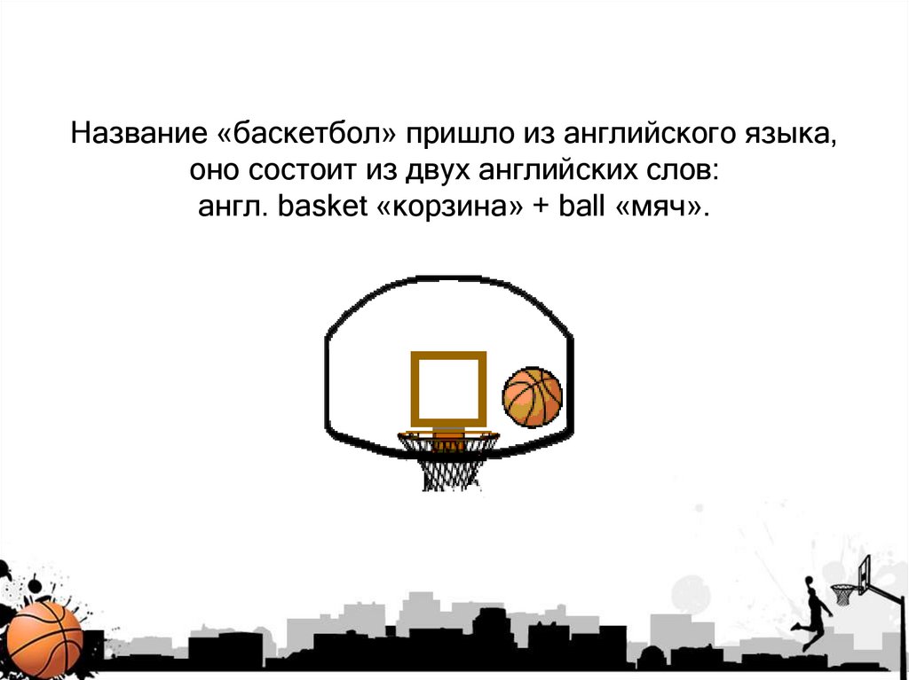 Название «баскетбол» пришло из английского языка,оно состоит из двух английских слов: