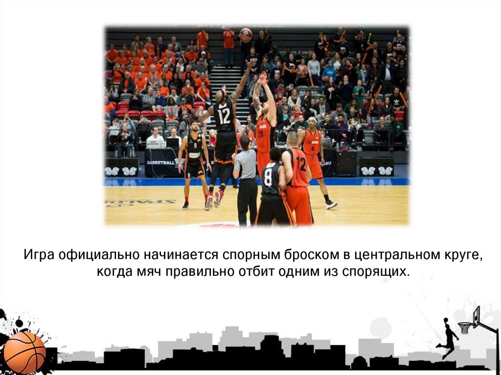 Игра официально начинается спорным броском в центральном круге,когда мяч правильно отбит одним из спорящих.