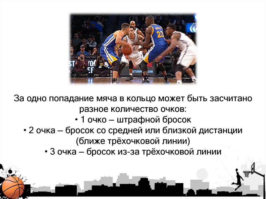 • 2 очка — бросок со средней или близкой дистанции
