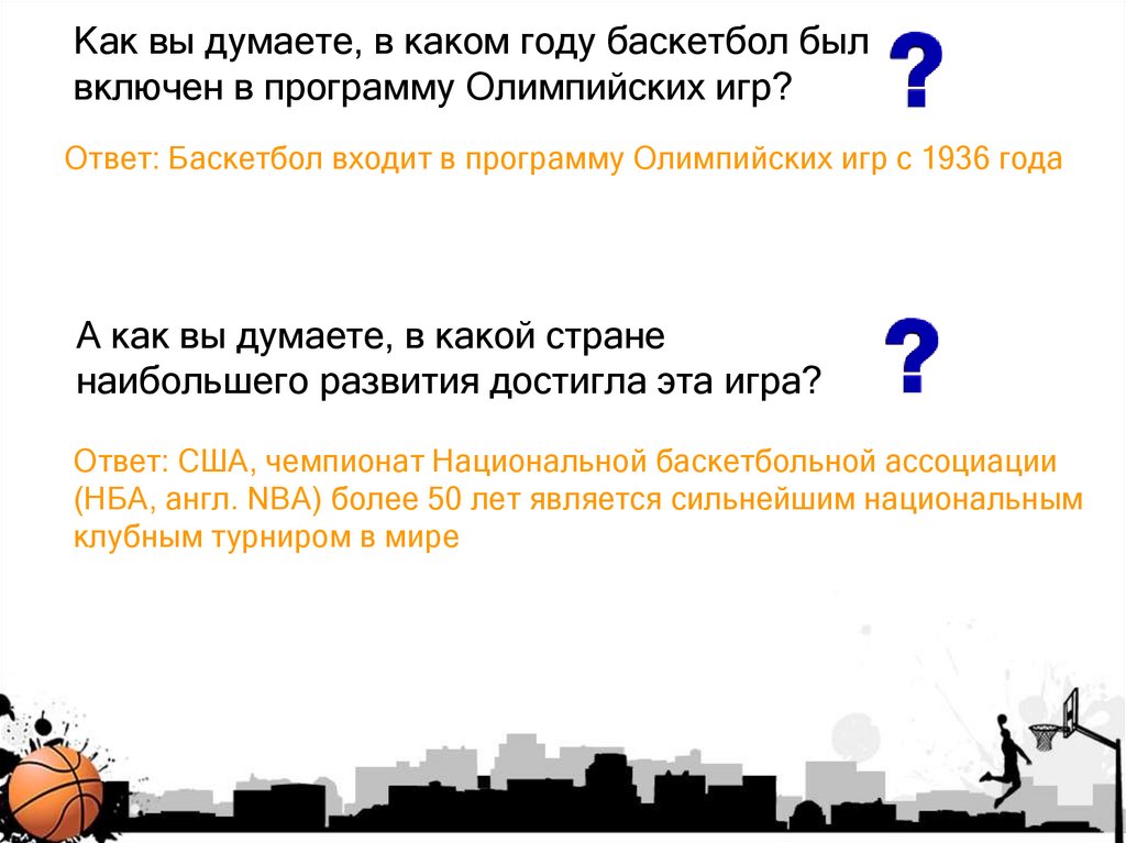 Ответ: Баскетбол входит в программу Олимпийских игр с 1936 года