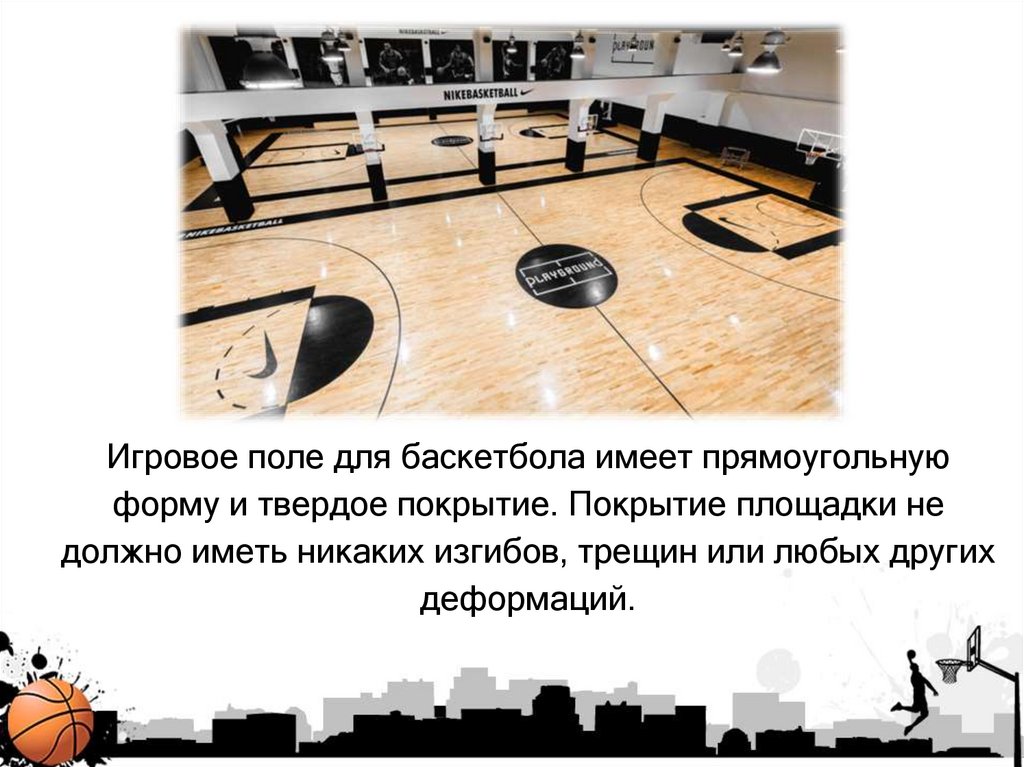 Игровое поле для баскетбола имеет прямоугольнуюформу и твердое покрытие. Покрытие площадки не