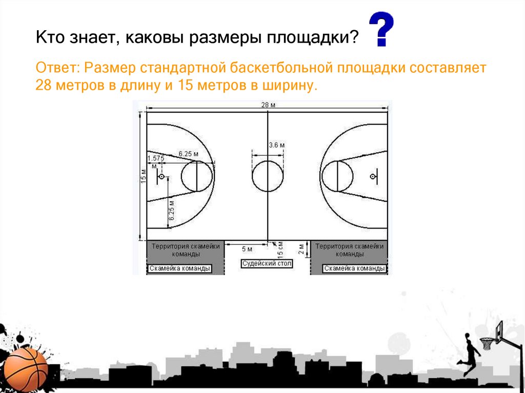 Кто знает, каковы размеры площадки?Ответ: Размер стандартной баскетбольной площадки составляет