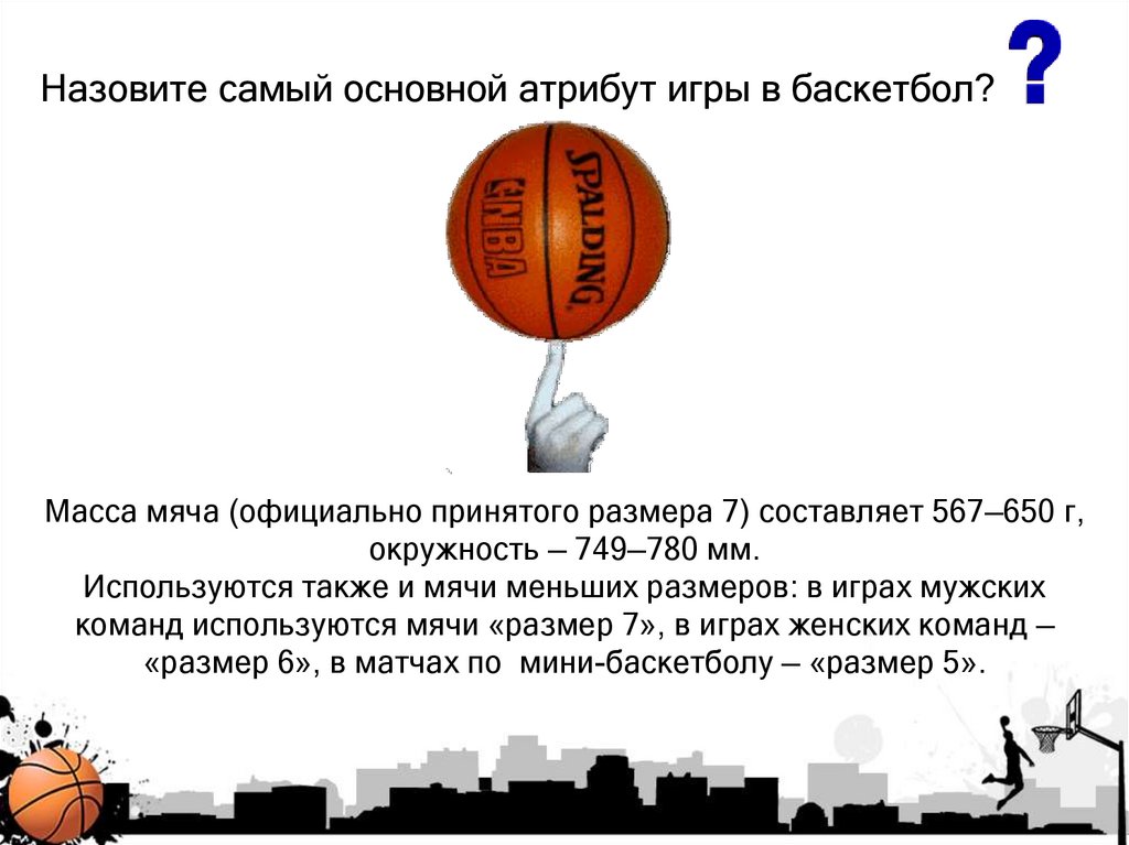 Назовите самый основной атрибут игры в баскетбол?Масса мяча (официально принятого размера 7) составляет 567—650 г,