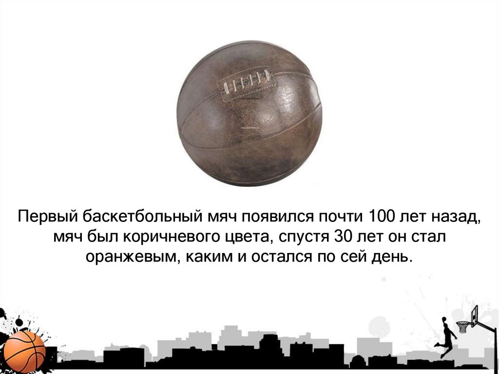 Первый баскетбольный мяч появился почти 100 лет назад,мяч был коричневого цвета, спустя 30 лет он стал