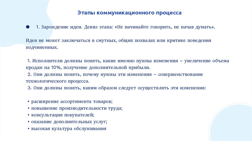 Этапы коммуникационного процесса1. Зарождение идеи. Девиз этапа: «Не начинайте говорить, не начав думать».
