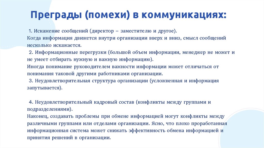 Преграды (помехи) в коммуникациях:1. Искажение сообщений (директор – заместителю и другое).