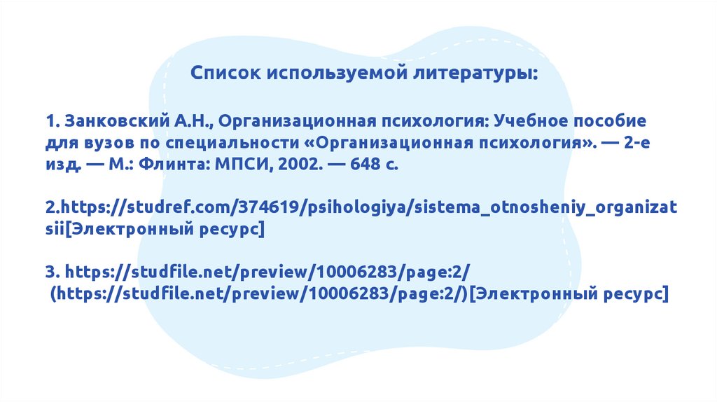 Список используемой литературы:1. Занковский А.Н., Организационная психология: Учебное пособие