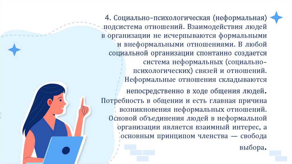 4. Социально-психологическая (неформальная)подсистема отношений. Взаимодействия людей