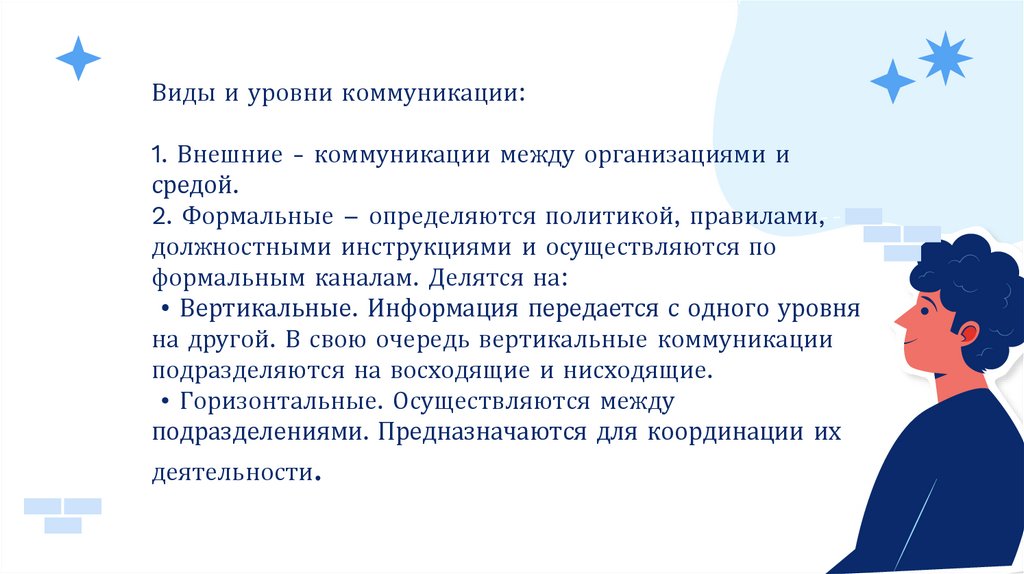 Виды и уровни коммуникации:1. Внешние - коммуникации между организациями и
