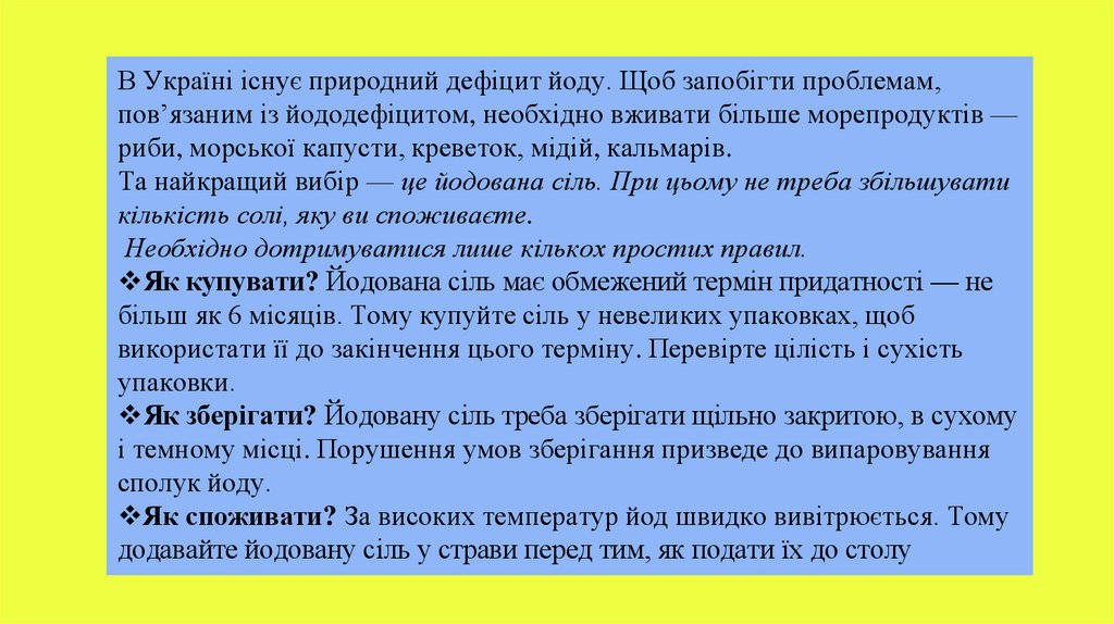 В Україні існує природний дефіцит йоду. Щоб запобігти проблемам,пов’язаним із йододефіцитом, необхідно вживати більше морепродуктів —
