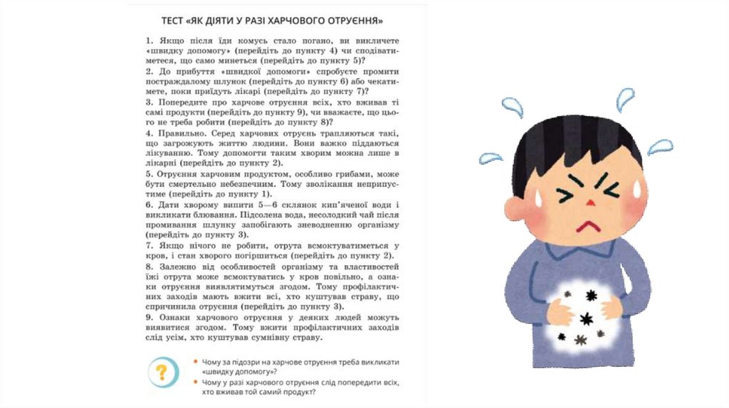 1.Запишіть у зошит як діяти при харчовому отруєнні (ст.59)
