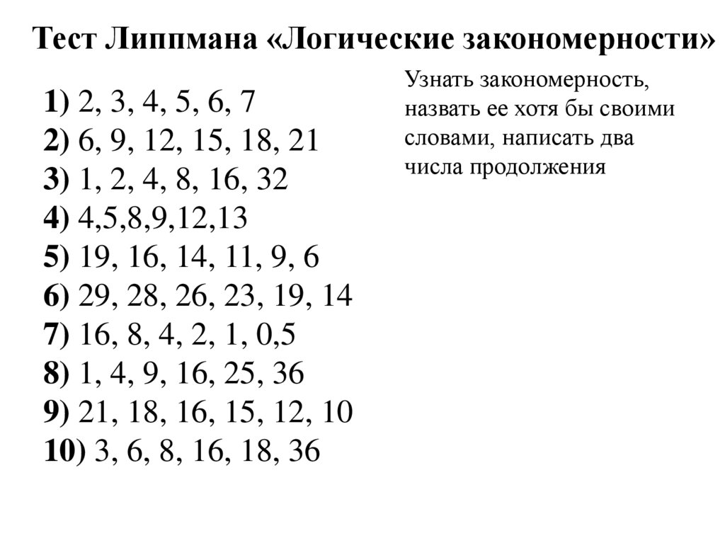 Тест Липпмана «Логические закономерности»1) 2, 3, 4, 5, 6, 7