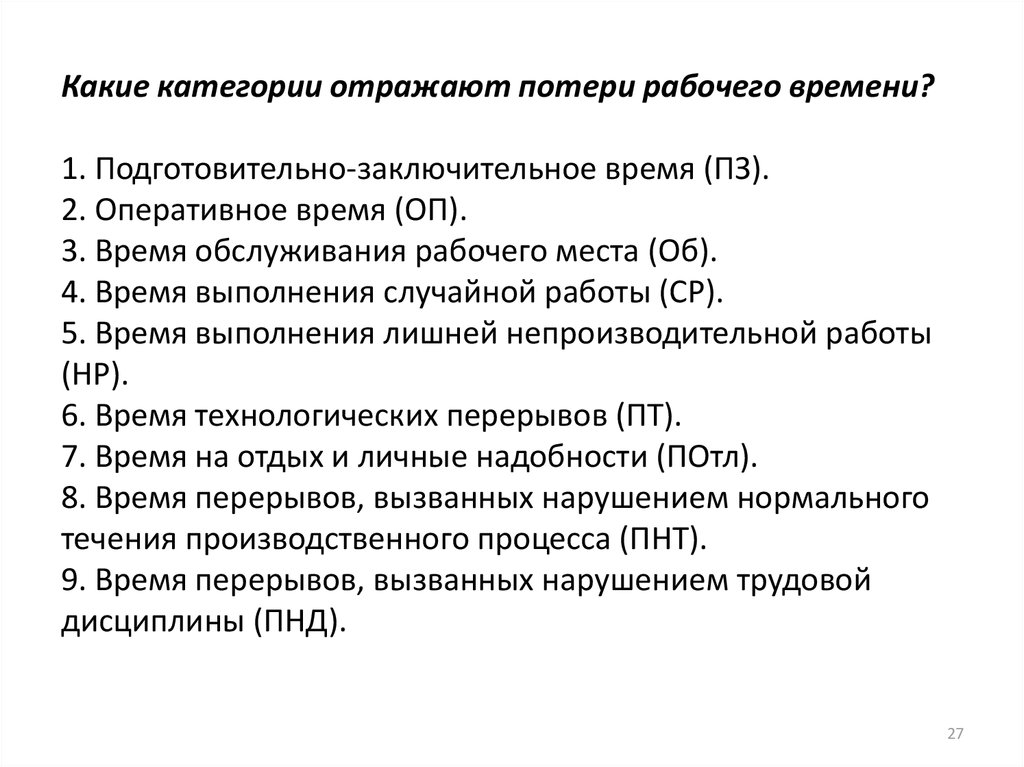 Какие категории отражают потери рабочего времени?1. Подготовительно-заключительное время (ПЗ).