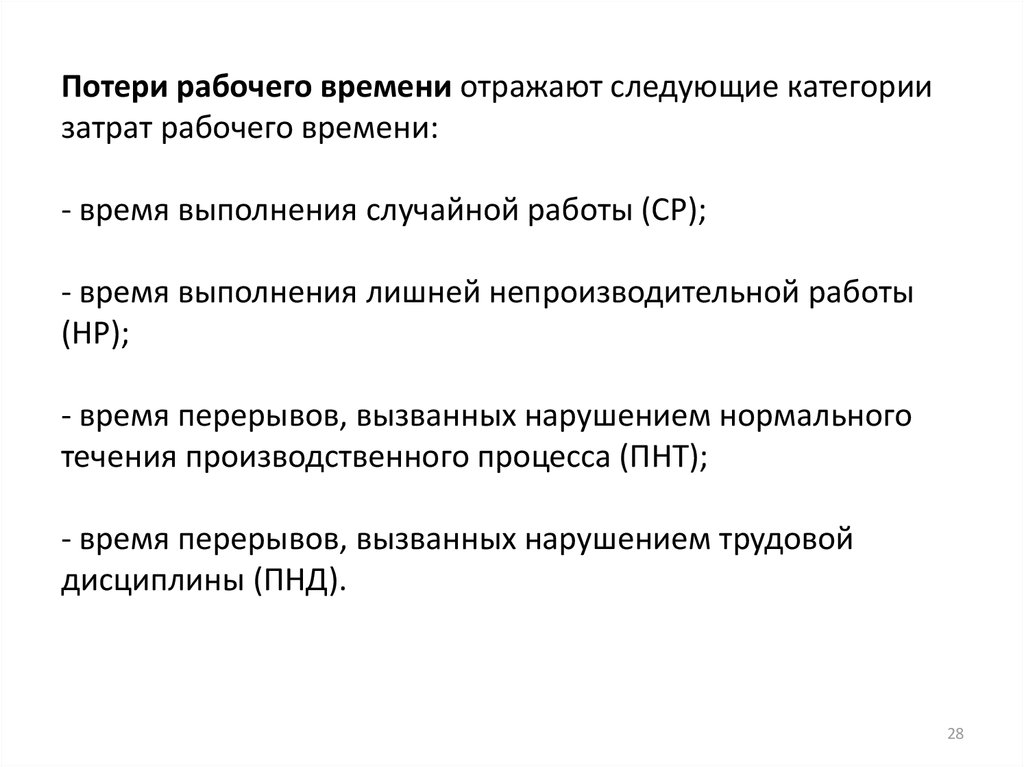 Потери рабочего времени отражают следующие категориизатрат рабочего времени: