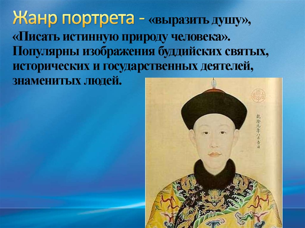 31. Жанр портрета - «выразить душу», «Писать истинную природу человека». Популярны изображения буддийских святых, исторических и государствен