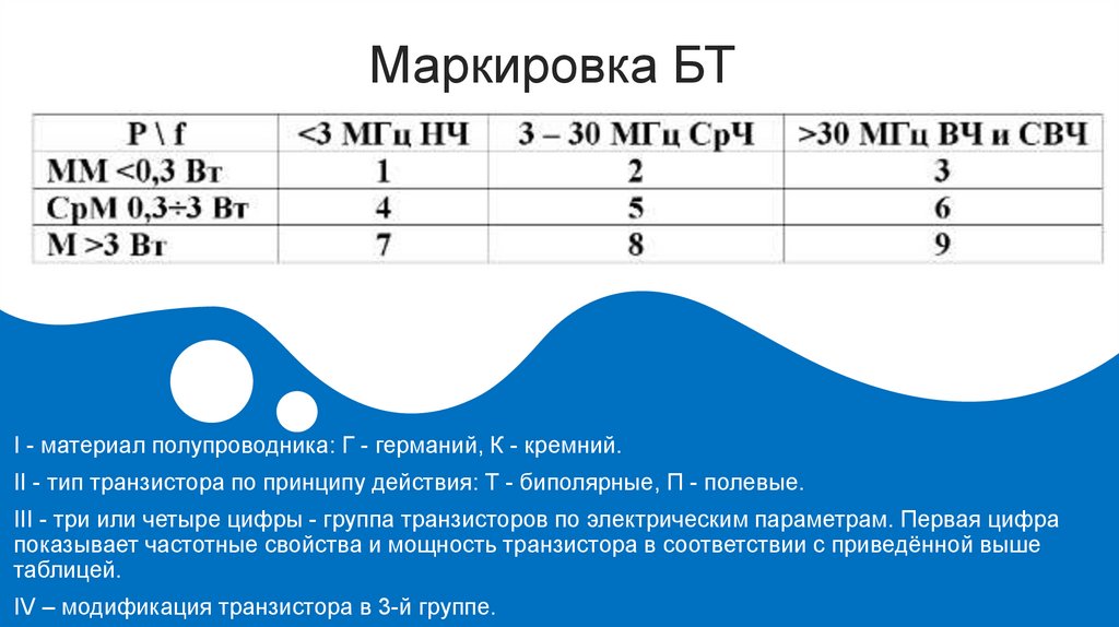 Маркировка БТI - материал полупроводника: Г - германий, К - кремний.