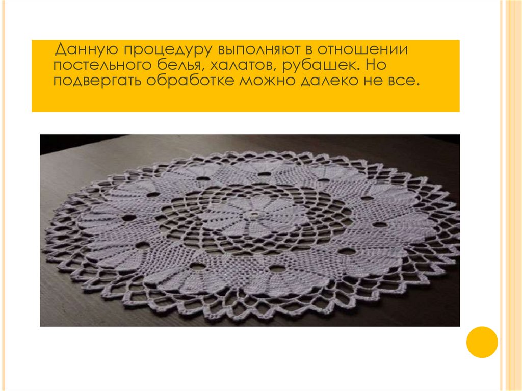 Данную процедуру выполняют в отношениипостельного белья, халатов, рубашек. Но