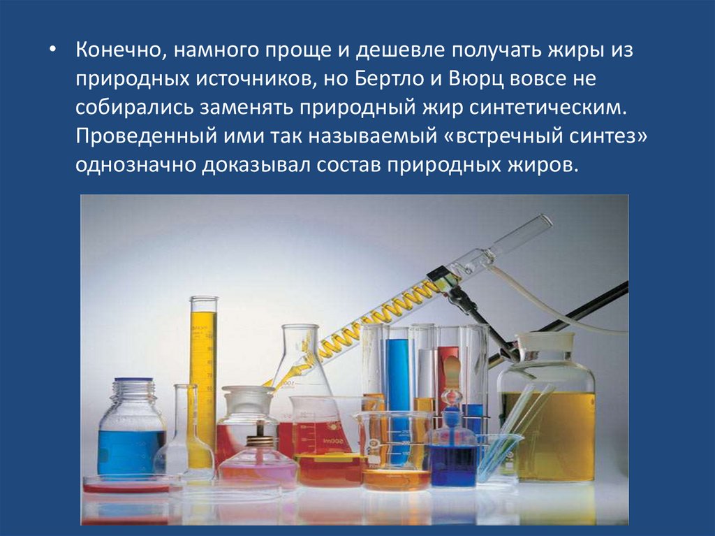 • Конечно, намного проще и дешевле получать жиры изприродных источников, но Бертло и Вюрц вовсе не