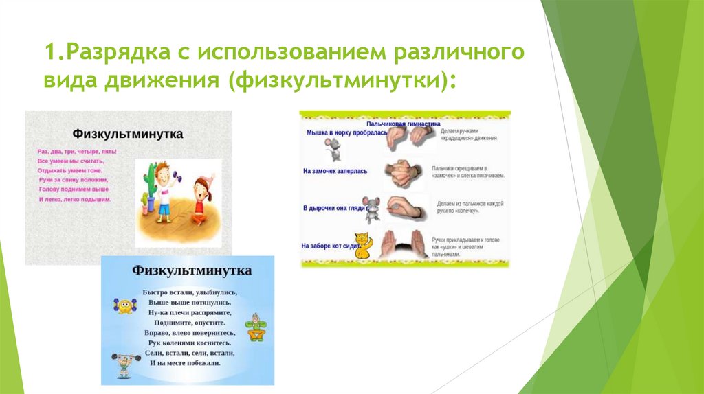 1.Разрядка с использованием различноговида движения (физкультминутки):