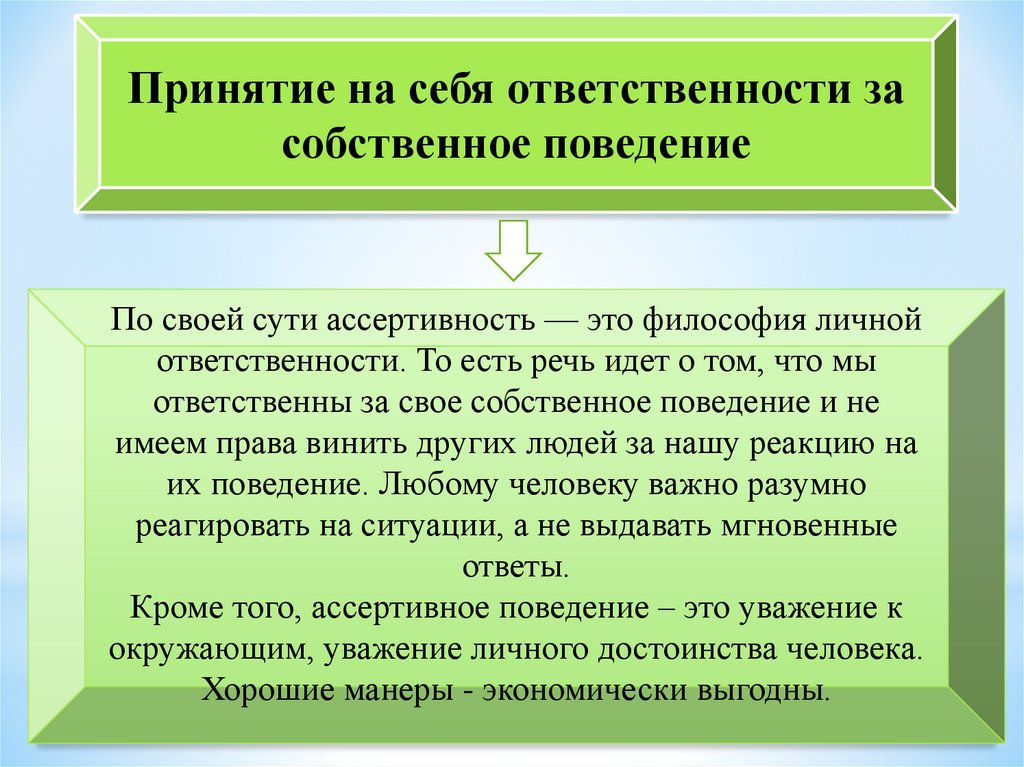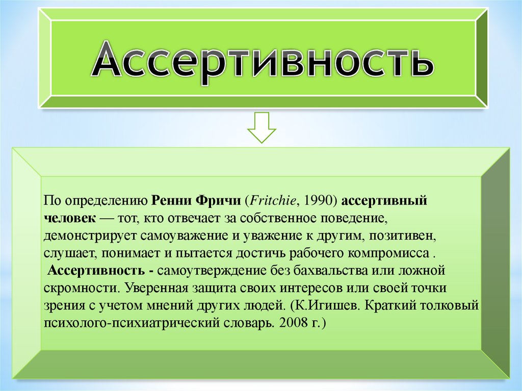 По определению Ренни Фричи (Fritchie, 1990) ассертивныйчеловек — тот, кто отвечает за собственное поведение,