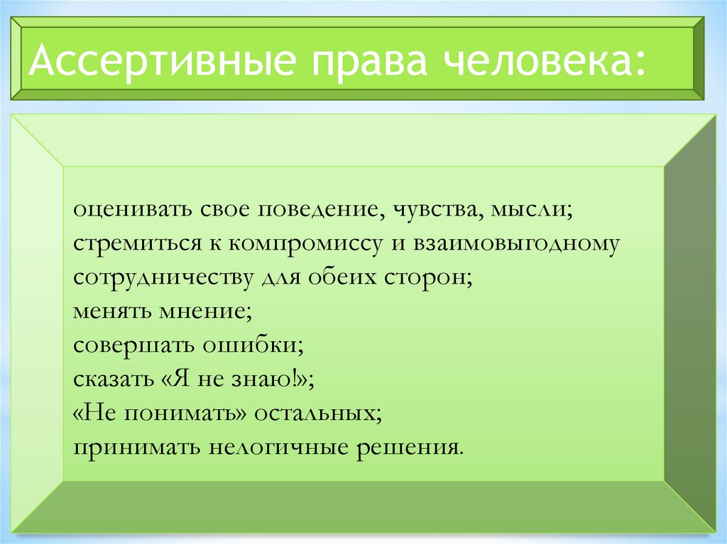 Ассертивные права человека:оценивать свое поведение, чувства, мысли;