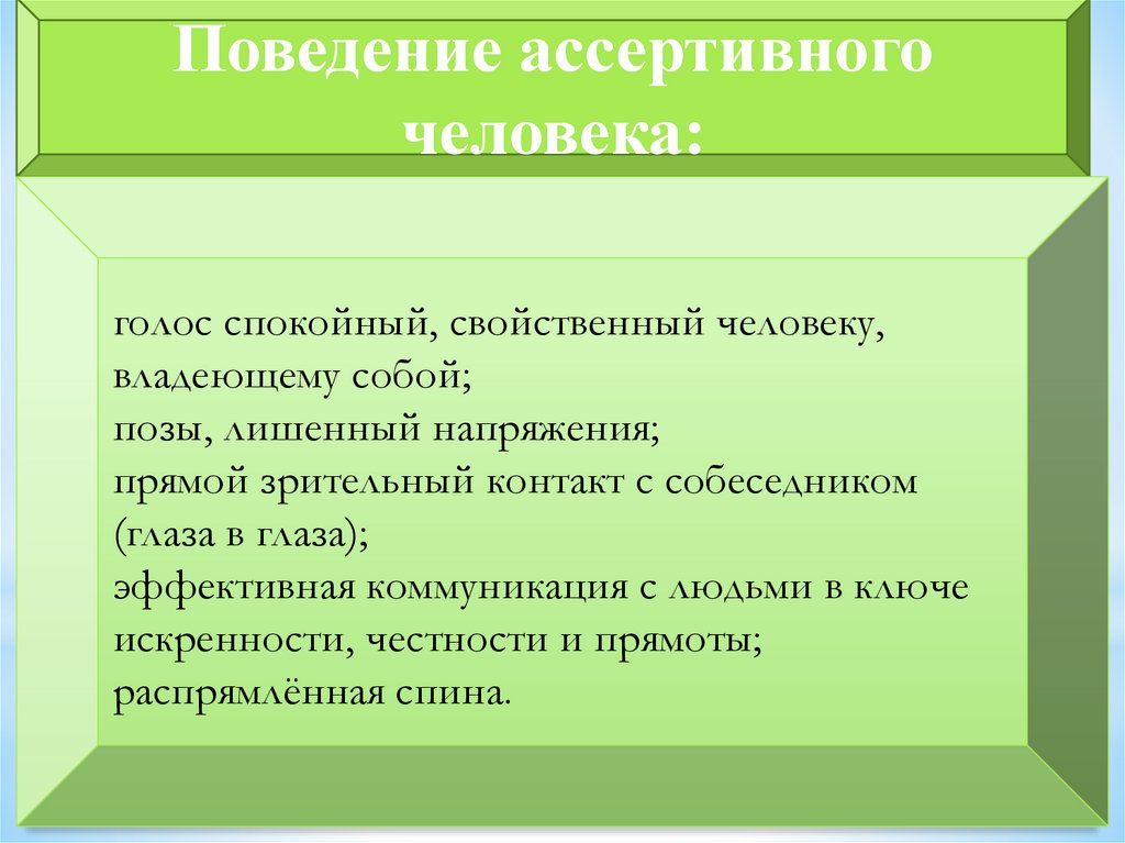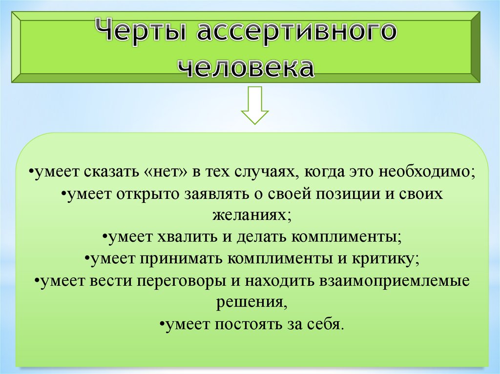 •умеет сказать «нет» в тех случаях, когда это необходимо;•умеет открыто заявлять о своей позиции и своих
