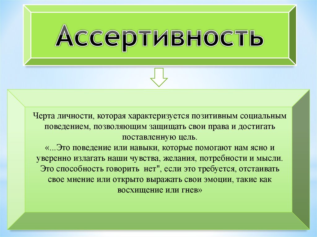 Черта личности, которая характеризуется позитивным социальнымповедением, позволяющим защищать свои права и достигать