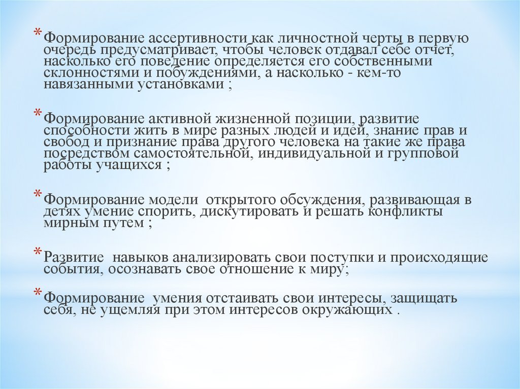 * Формирование ассертивности как личностной черты в первуюочередь предусматривает, чтобы человек отдавал себе отчет,