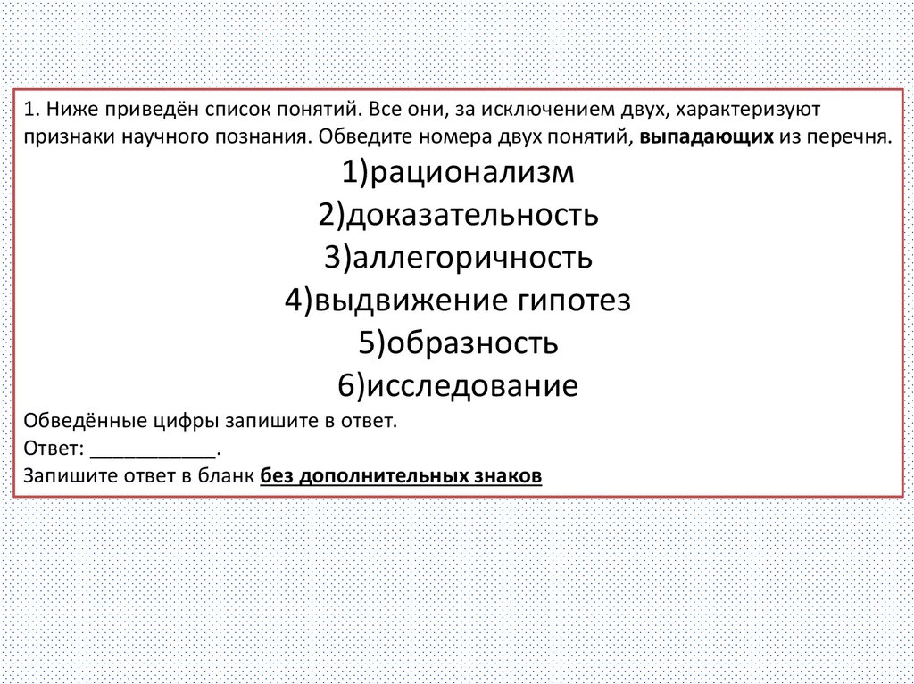 1. Ниже приведён список понятий. Все они, за исключением двух, характеризуютпризнаки научного познания. Обведите номера двух понятий, выпадающих из перечня.