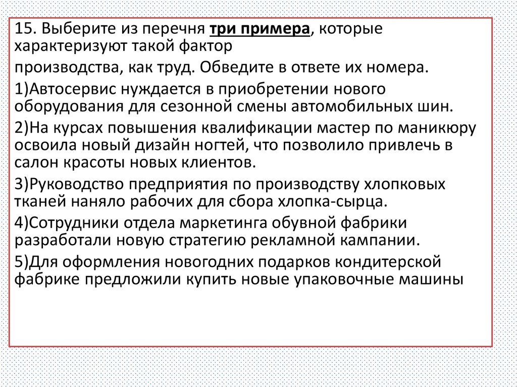15. Выберите из перечня три примера, которыехарактеризуют такой фактор