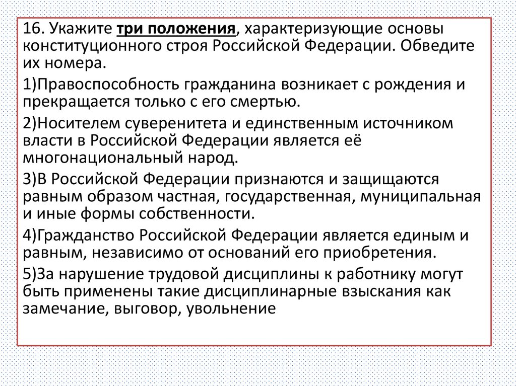 16. Укажите три положения, характеризующие основыконституционного строя Российской Федерации. Обведите