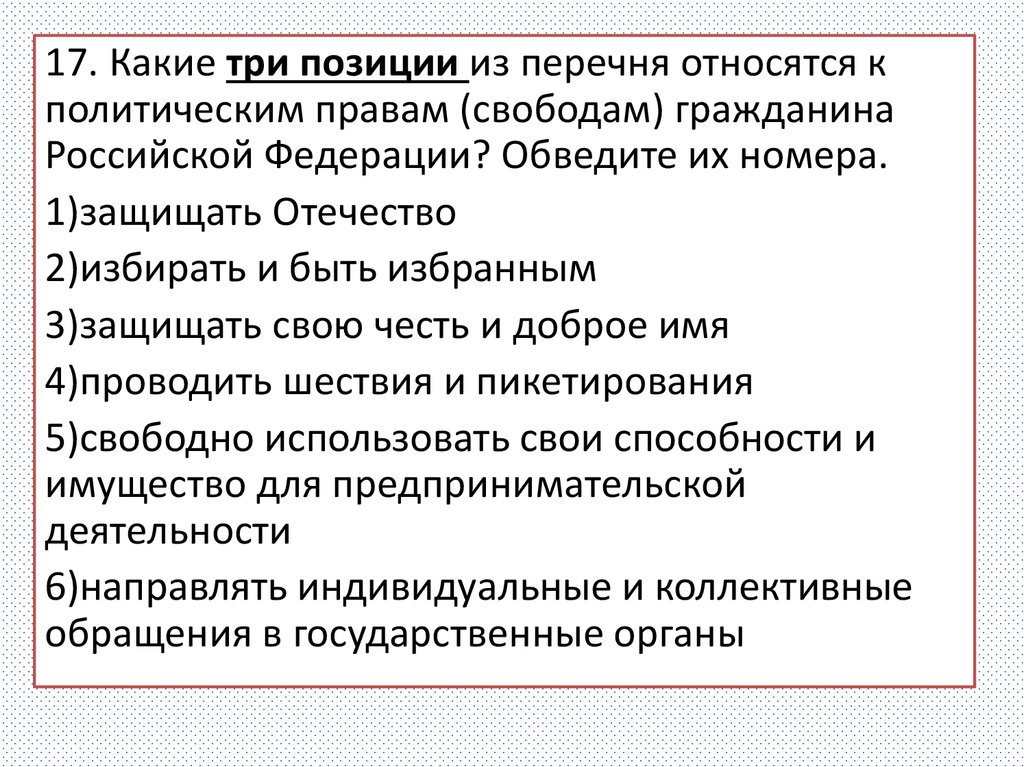 17. Какие три позиции из перечня относятся кполитическим правам (свободам) гражданина