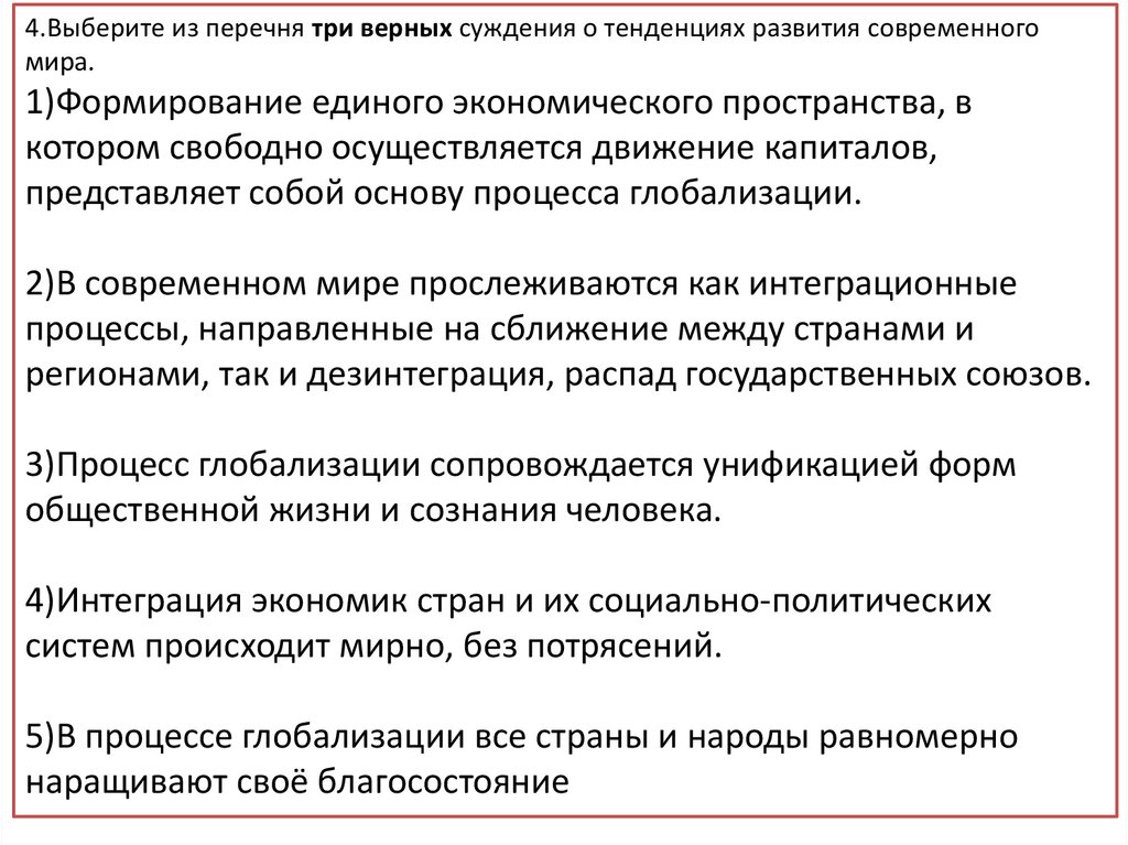 4.Выберите из перечня три верных суждения о тенденциях развития современногомира.