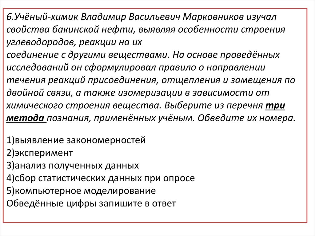 6.Учёный-химик Владимир Васильевич Марковников изучалсвойства бакинской нефти, выявляя особенности строения