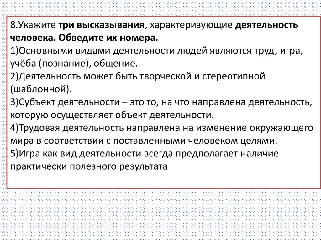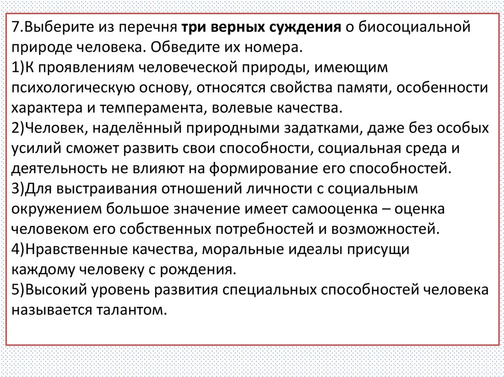 7.Выберите из перечня три верных суждения о биосоциальнойприроде человека. Обведите их номера.